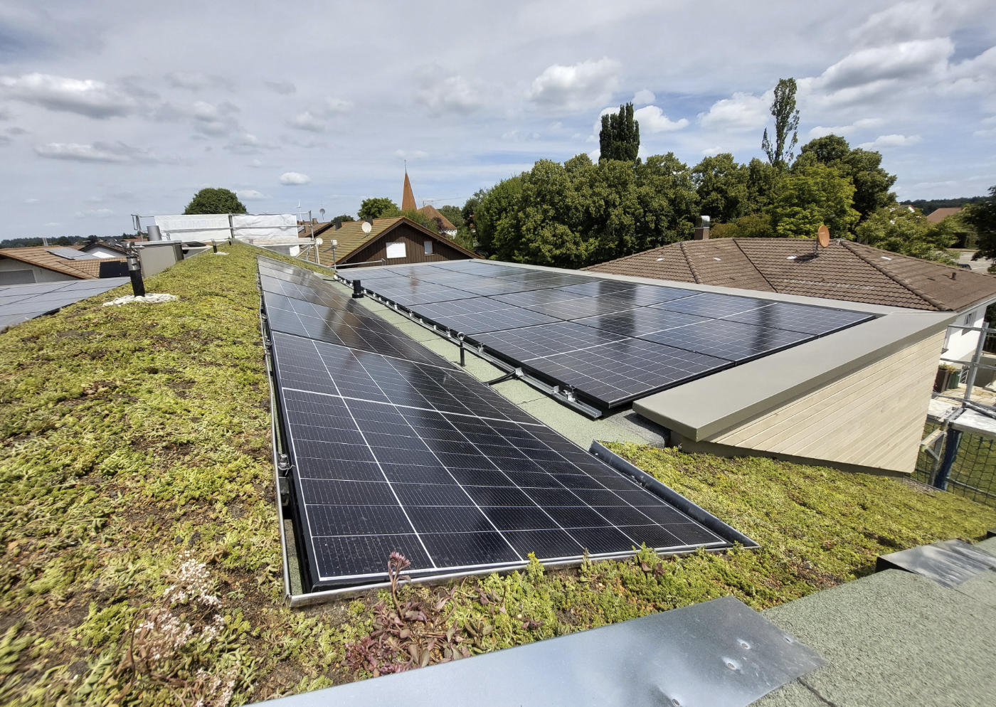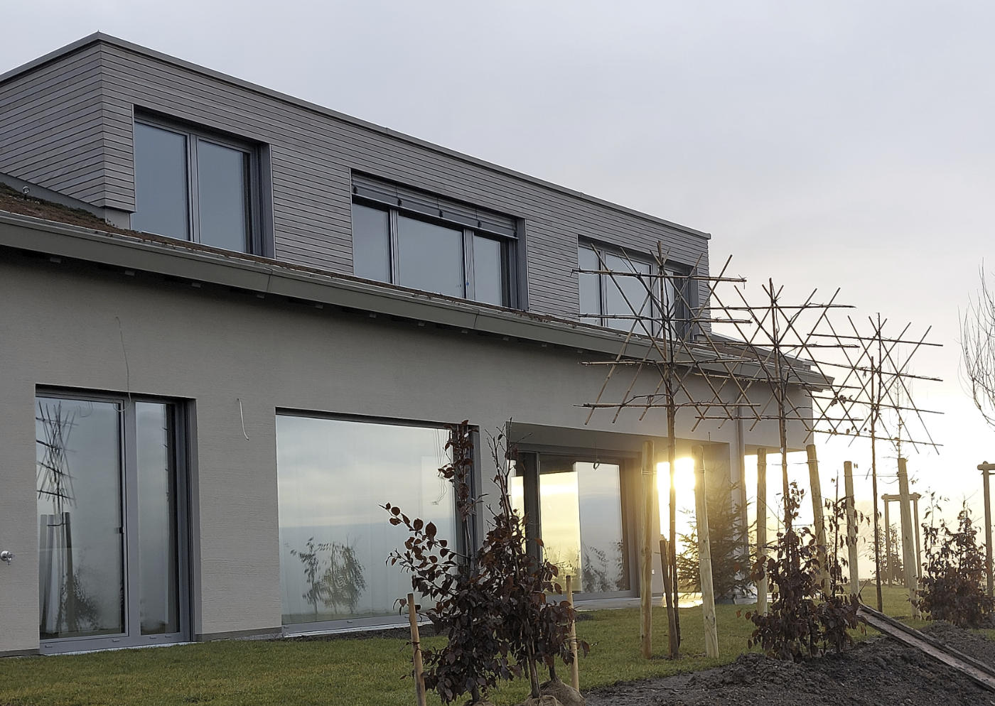 Das bestehende Einfamilien-Wohnhaus von 1988 wird komplett kernsaniert und als 2-Familienhaus umgebaut und erweitert. Das Dachgeschoss wird abgerissen und durch einen neuen Dachstuhl und Dachgauben in Massivholzbauweise ersetzt. Das Satteldach wird dabei extensiv begrünt und die Dachflächen der Gauben von unten nicht erkennbar komplett mit PV-Modulen belegt. Das Haus erhält dadurch sein besonderes Erscheinungsbild mit Gründach – und ohne die optische Störung durch eine Photovoltaikanlage. Das Wohnhaus wird mit einer Luft-Wasser-Wärmepumpe versorgt, erhält zwei zentrale Wohnraumlüftungsanlagen mit Wärmerückgewinnung für beide Wohneinheiten und eine Regenwasserzisterne. Der Innenbereich wird mit einem besonderen Farb- und Materialkonzept, sowie mit besonderen Ausbau- und Beleuchtungsdetails gestaltet. Großzügige, teils überdachte Außenbereiche und Balkon werden ergänzt durch neu gestaltete Außenflächen.